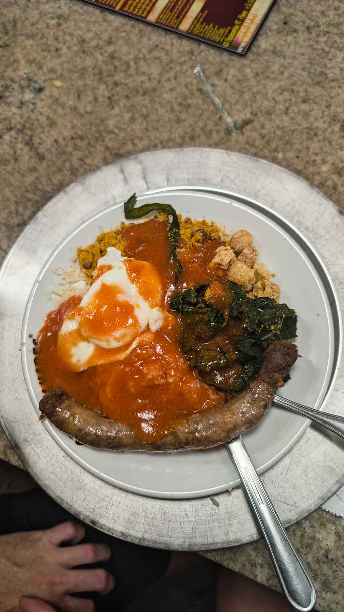 The following day we returned to the central market for more coffee and pão de queijo, more incredible quibes, and some nuts and dates for yet another 16 hour overnight bus later that day. For lunch we visited a famous restaurant called Café Palhares, which opened in 1938 and was one of Anythony Bourdain’s favourite places to eat when he visited Belo. I’m usually not one to wait in line to eat, but I really, really wanted to eat here so we waited for a good 40 minutes before being let inside to sit at the bar, sandwiched between old locals. The restaurant is famous for serving up the dish ‘KAOL’, which is an acronym for Kachaça, arroz, ovos e linguića. This is basically a plate of rice and farofa, sauteed kale, a big old sausage, some sort of tomato pasta sauce type thing, crispy pork crackling and a fried egg, usually served with a shot of cachaça. Being so early in the day, we opted to not take a shot of cachaça, but I highly enjoyed the dish nonetheless. In fact, it was just a really cool experience. The place was absolutely packed, with staff screaming orders at each other, old brazilian guys downing shots of cachaça and laughing amongst themselves and the old servers. You could hardly move in the joint, could hardly hear yourself thinking, but it was a really great feeling of being in Brazil, doing a really Brazilian thing with locals who are having a great time. The servers seemed really happy that we were there, and were amazed to hear we were from Australia. There were many handshakes and smiles as we walked out with full bellies into the torrential rain, to catch an uber back to the hostel and pack up our things for the afternoon’s bus.
